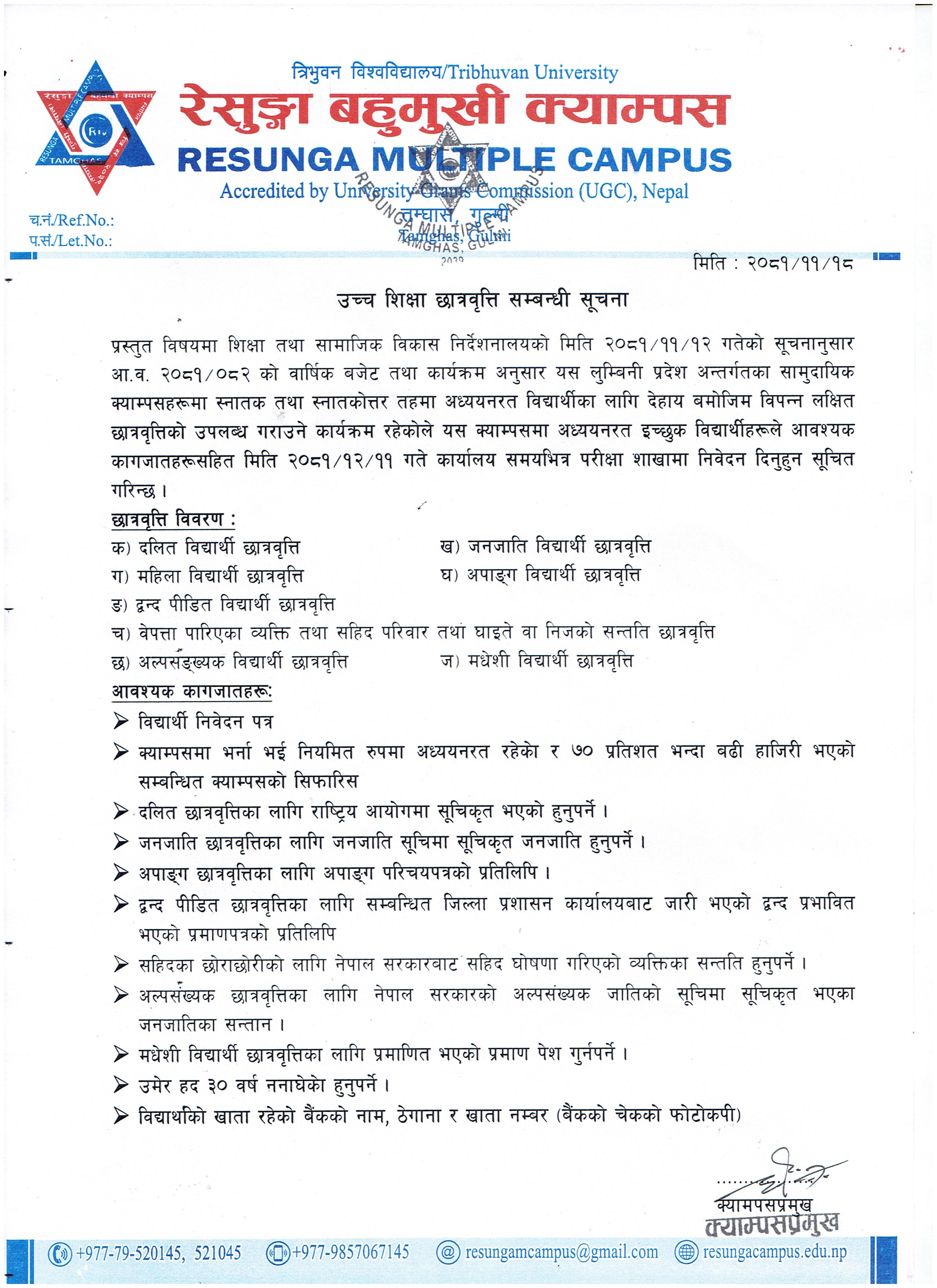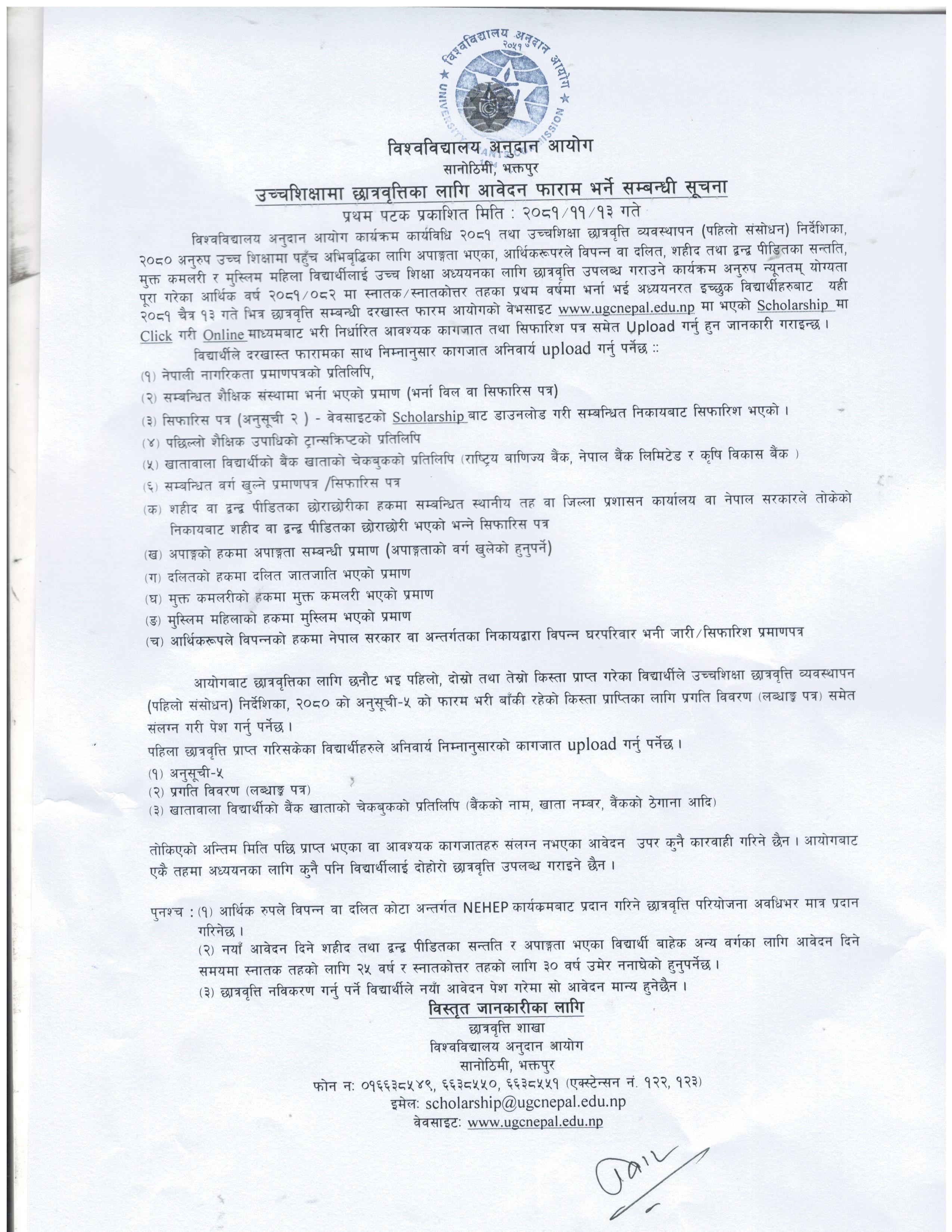 विश्वविद्यालय अनुदान आयाेगकाे छात्रवृत्ति सम्बन्धी सूचना