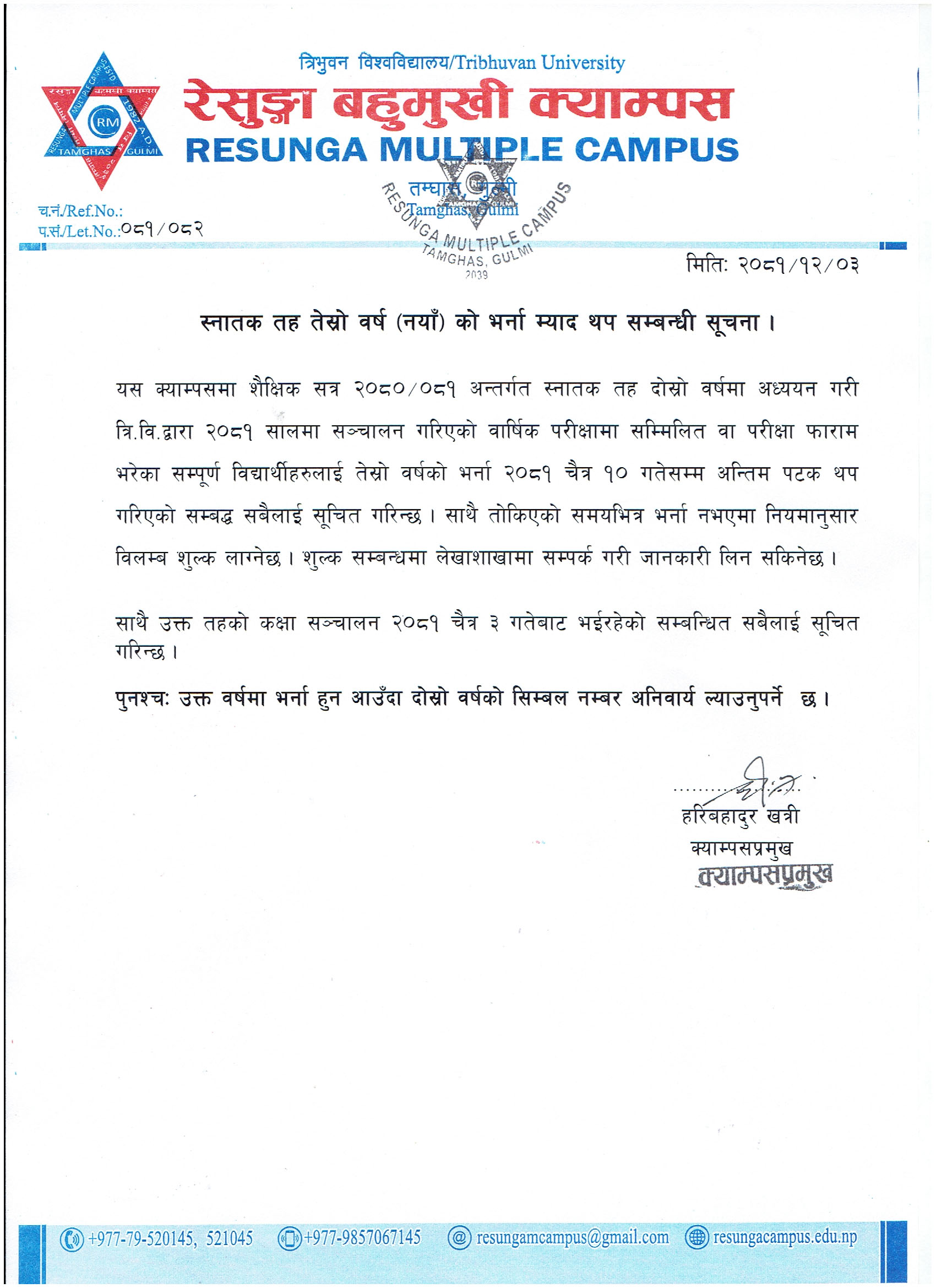 स्नातक तह तेस्रो वर्ष (नयाँ)काे भर्ना म्याद थप सम्बन्धी सूचना