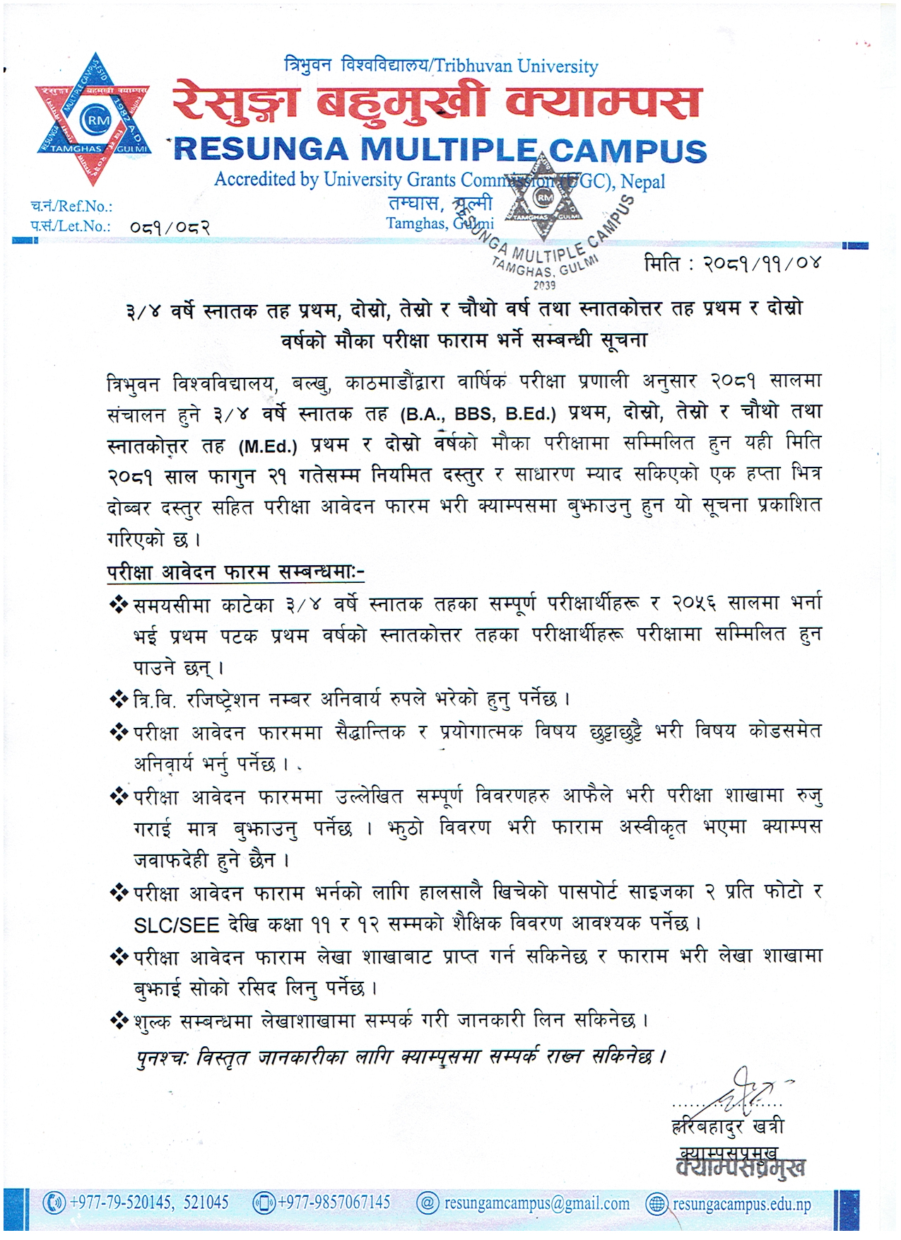 स्नातक तह तथा स्नातकाेत्तर तहको माैका परीक्षा फाराम भर्ने सम्बन्धी सूचना