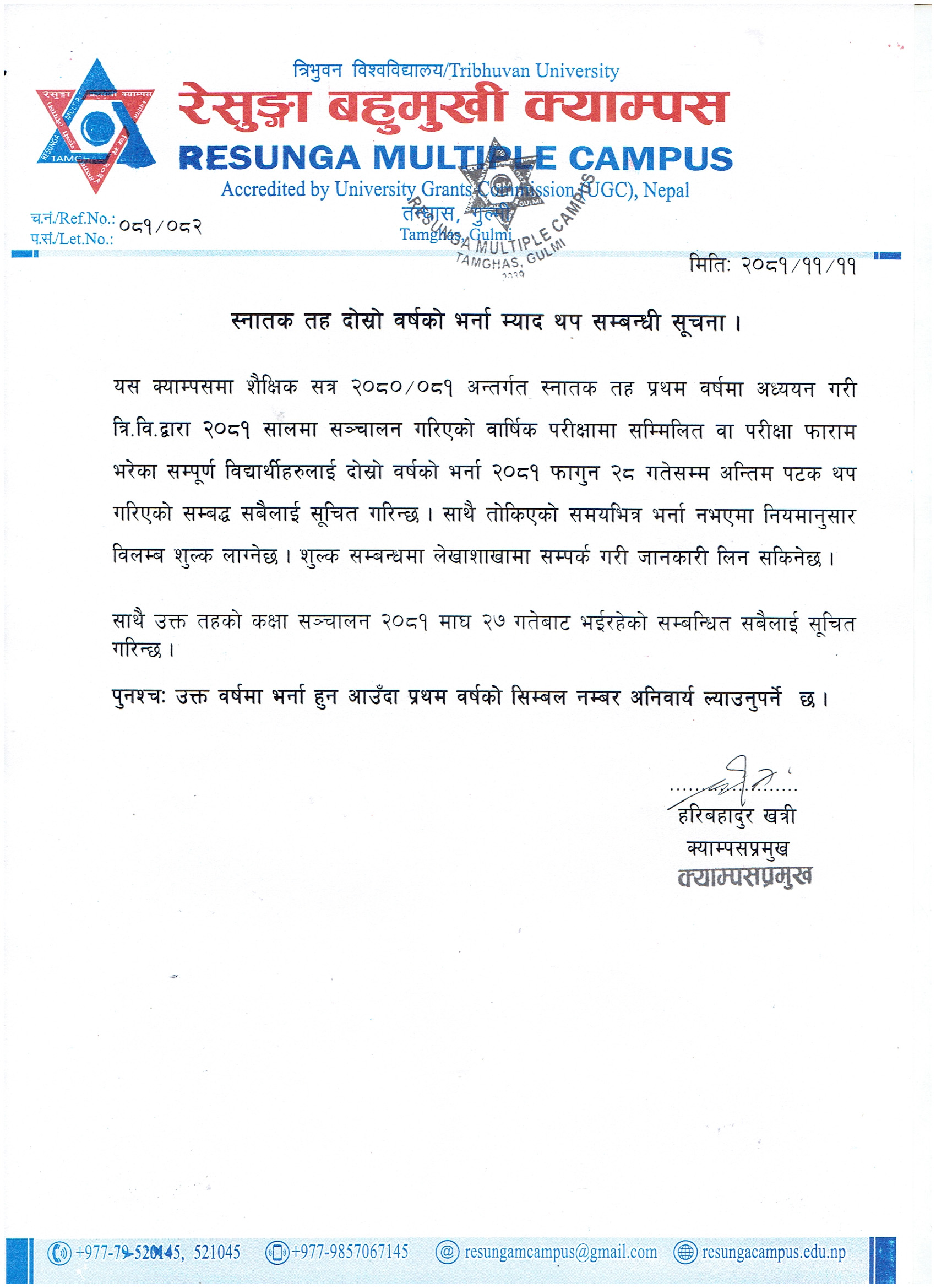 स्नातक तह दाेस्रो वर्षको भर्ना म्याद थप सम्बन्धी सूचना