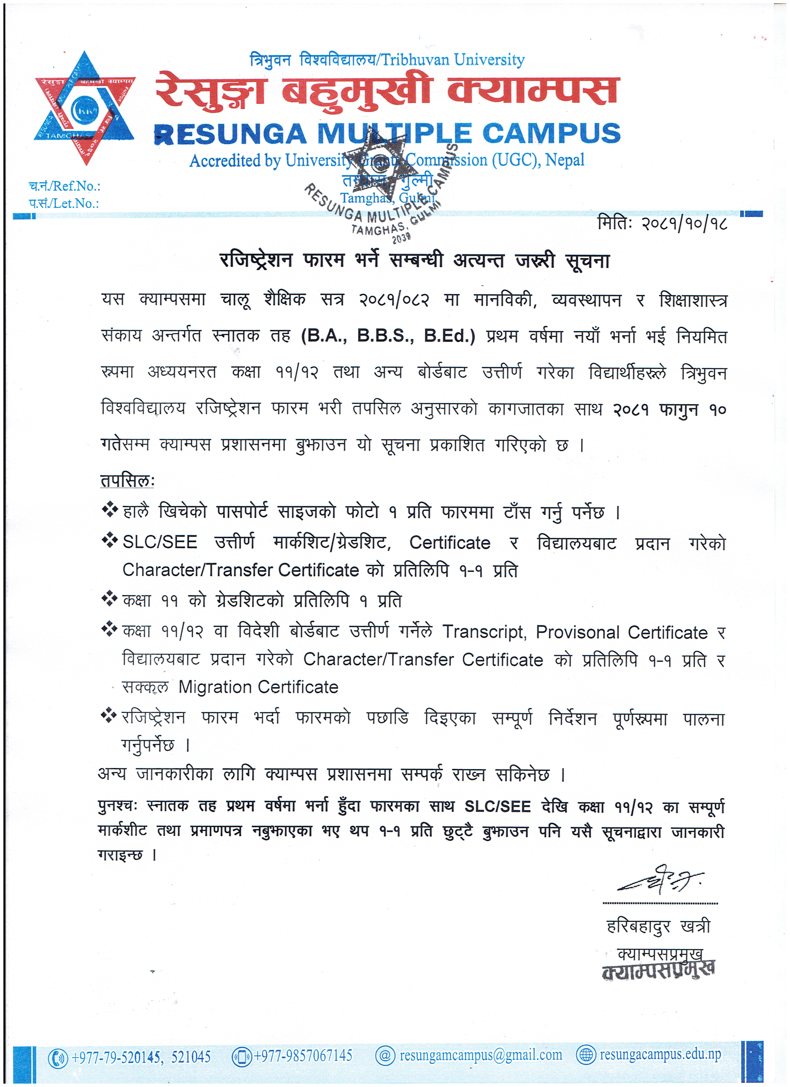 त्रि.वि. रजिष्ट्रेशन फाराम भर्ने सम्बन्धी संशाेधित सूचना