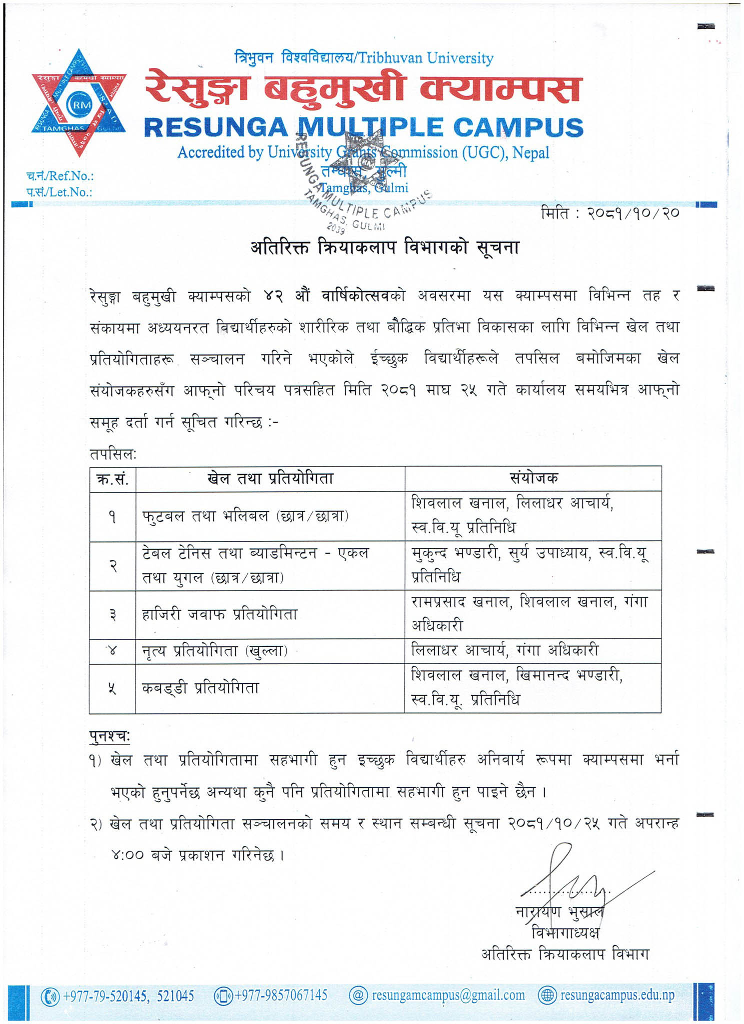 अतिरिक्त क्रियाकलाप विभागकाे सूचना