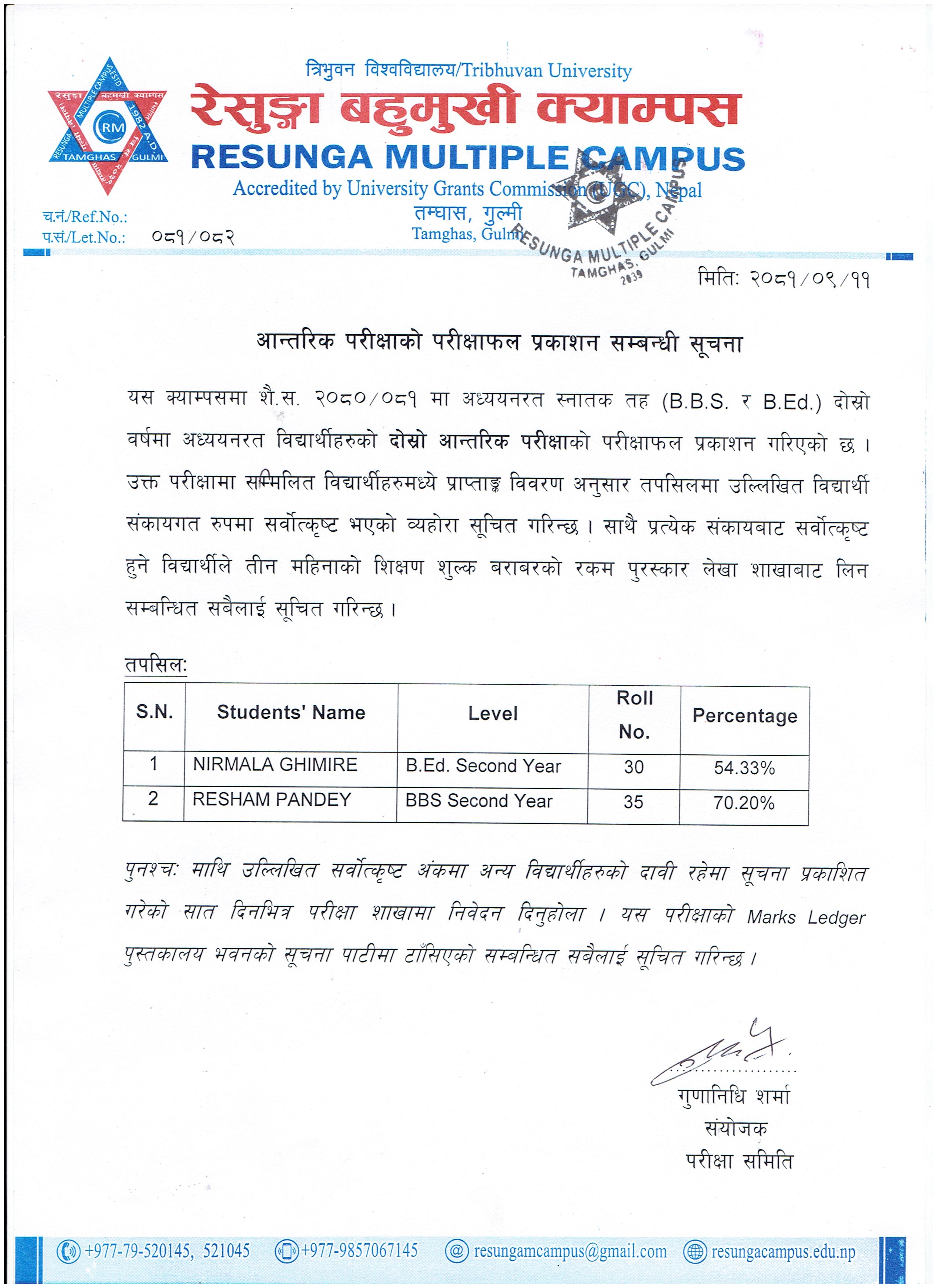 आन्तरिक परीक्षाकाे परीक्षाफल प्रकाशन सम्बन्धी सूचना